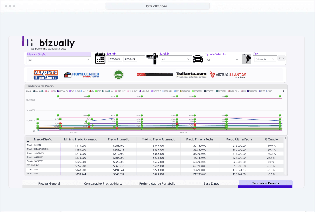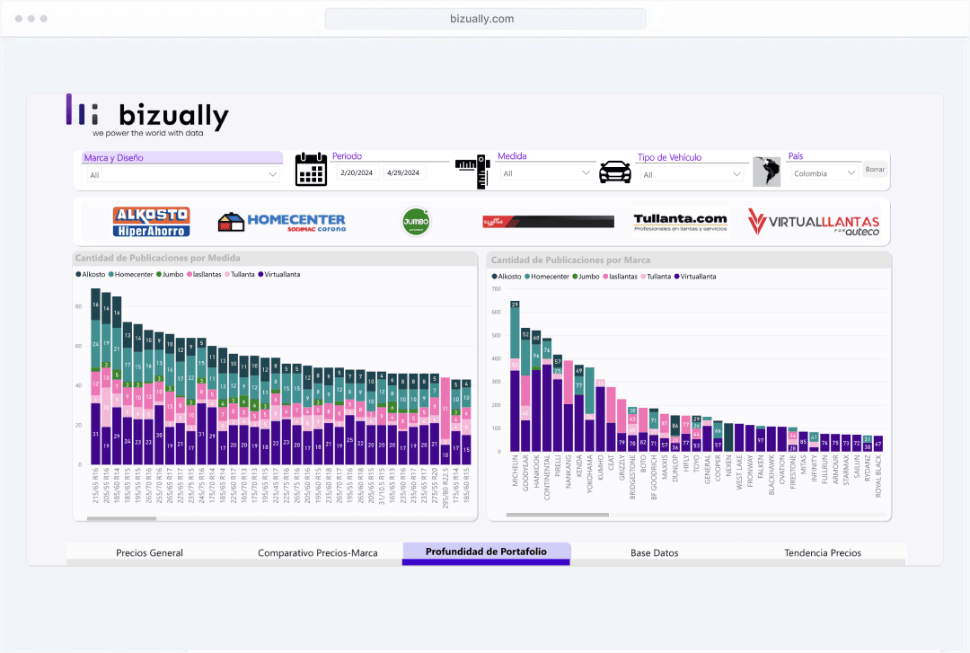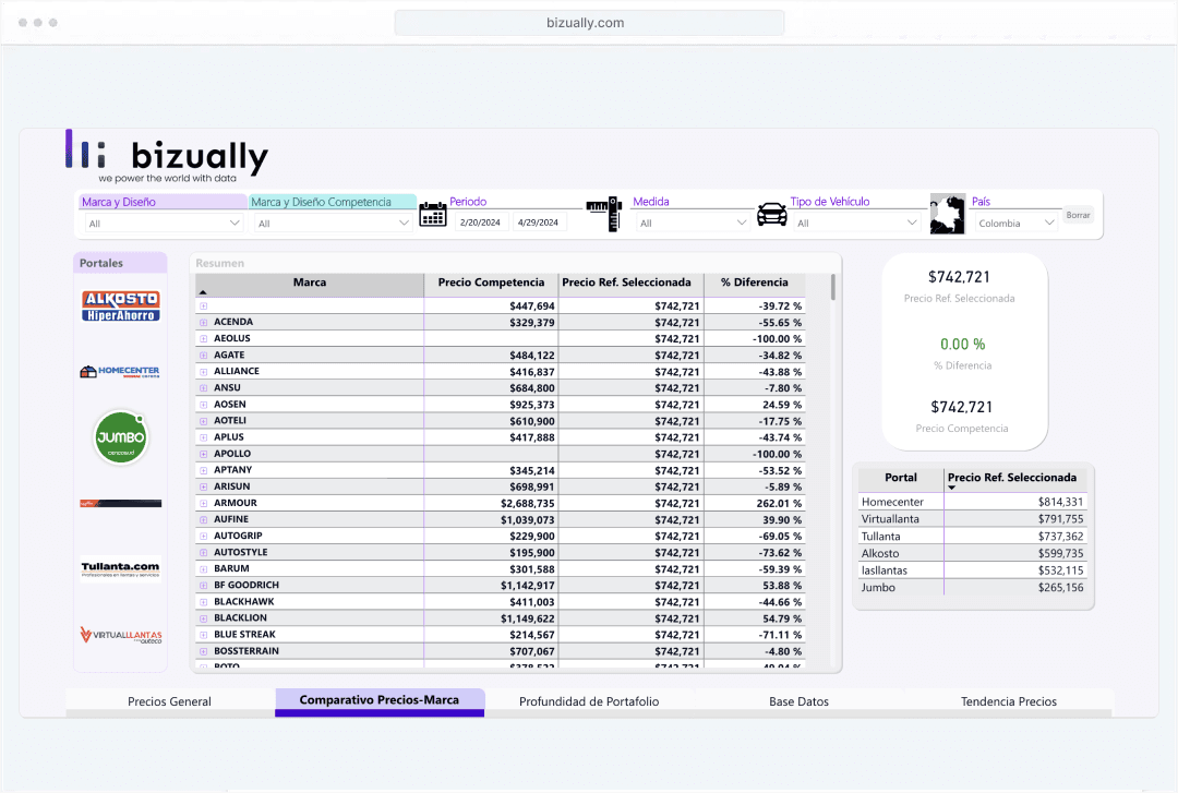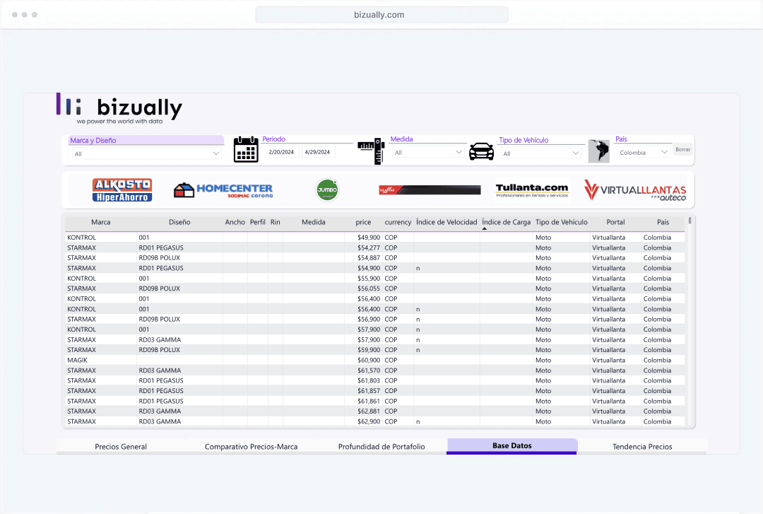 Con Bizually, accede a todos los precios del mercado de llantas en un solo lugar. Nuestra experiencia y análisis avanzados te brindan una visión completa para tomar decisiones informadas.